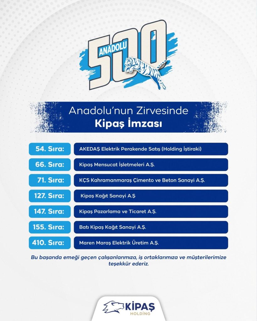 Kipaş Holding; iştiraki olan AKEDAŞ (54. sıra) ile grubun sanayi ve üretimdeki amiral gemileri Kipaş Mensucat (66. sıra) ve listede 23 sıra yükselen KÇS Kahramanmaraş Çimento (71. sıra) sayesinde, listenin en prestijli dilimi olan ilk 100 içerisinde yer aldı. Bu tabloyla Kipaş, “Kahramanmaraş’tan ilk 100 listesinde 3 şirketiyle yer alan tek firma” unvanını kazanarak rakiplerinden net bir şekilde ayrıştı.