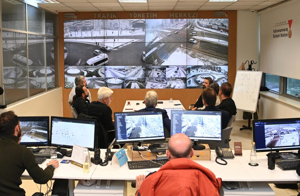 Kahramanmaraş Büyükşehir Belediyesi, bugün öğle saatlerinden itibaren şehir genelinde etkili olan yoğun kar yağışının ulaşımda aksamalara neden olmaması ve vatandaşların günlük yaşamının olumsuz etkilenmemesi için kış şartlarıyla mücadelesini aralıksız sürdürüyor. Büyükşehir Belediyesi, tüm birimleriyle sahada ve koordinasyon merkezlerinde çalışmalarını yoğunlaştırmış durumda.Büyükşehir Belediye Başkanı Fırat Görgel, yürütülen çalışmaları yerinde takip etmek amacıyla Trafik Yönetim Merkezi’ni ziyaret ederek şehir genelindeki son durumu anbean inceledi. Başkan Görgel, merkezde bulunan 264 kameradan şehir merkezi ve 11 ilçedeki ana arterler, bulvarlar, kavşaklar, cadde ve sokaklardaki yol durumunu canlı olarak izledi. Ulaşım Dairesi Başkanı Gökhan Başpınar’dan detaylı bilgiler alan Başkan Görgel; kar küreme, tuzlama ve solüsyon uygulamalarının sürdürüldüğü noktalar, yağışın yoğunlaştığı bölgeler ve trafik akışının yavaşladığı güzergâhlar hakkında kapsamlı değerlendirmelerde bulundu.