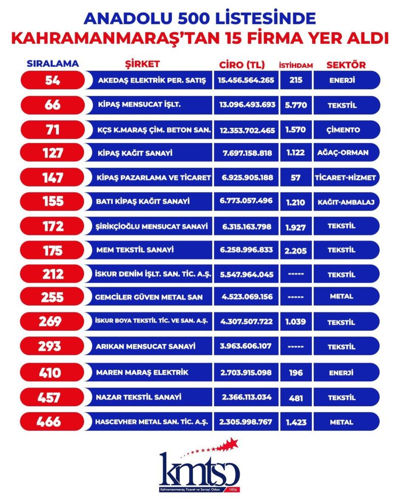 “Kahramanmaraşlı firmaların bu prestijli listede yer alması, şehrin iş dünyasının dinamizmini ve potansiyelini bir kez daha gözler önüne sermiştir. Listeye giren firmalar, üretim güçleriyle, istihdama sundukları katkılarla ve ülke ekonomisine sağladıkları katma değerle şehrimizin gururu olmuştur. Emeği geçen tüm çalışanları ve yöneticileri tebrik ediyoruz.”