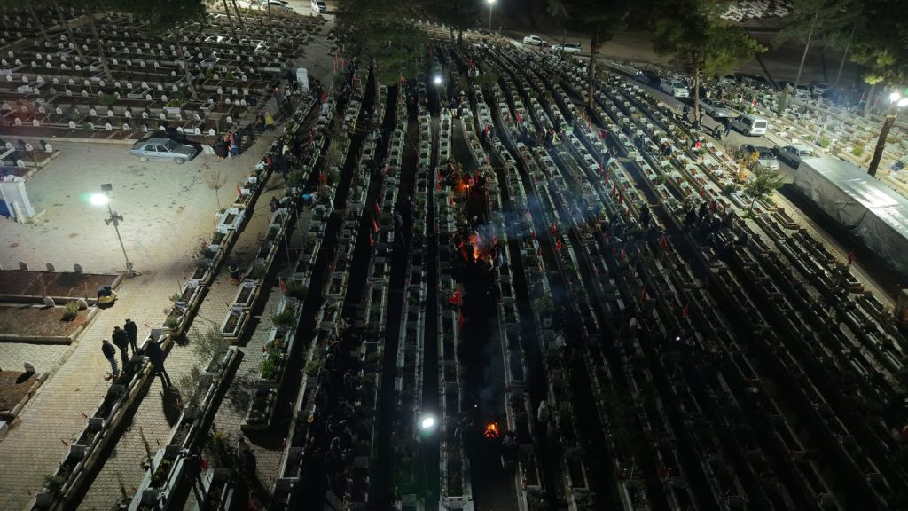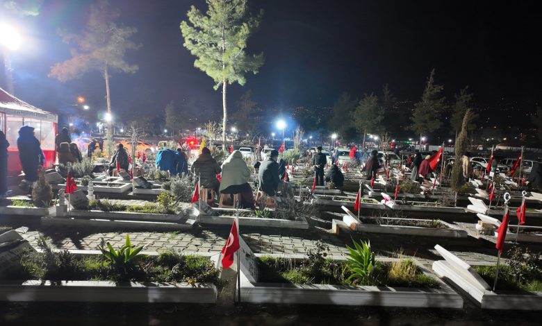 6 Şubat 2023’te meydana gelen ilk depremin saati olan 4:17’de binlerce vatandaş, kaybettikleri yakınlarını anmak ve dualarla yad etmek için mezarlıkta bir araya geldi.